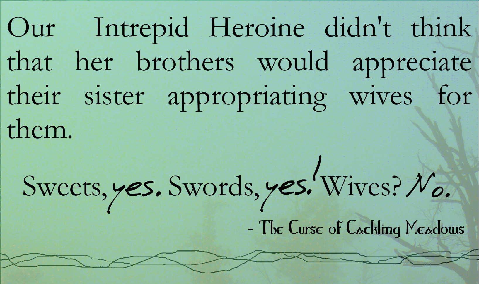 Wohoo! We’ve made it! The sequel to Our Intrepid Heroine has come. Join me as we cut the metaphorical ribbon and present … dunn dunnnnnn … The Curse of Cackling Meadows!