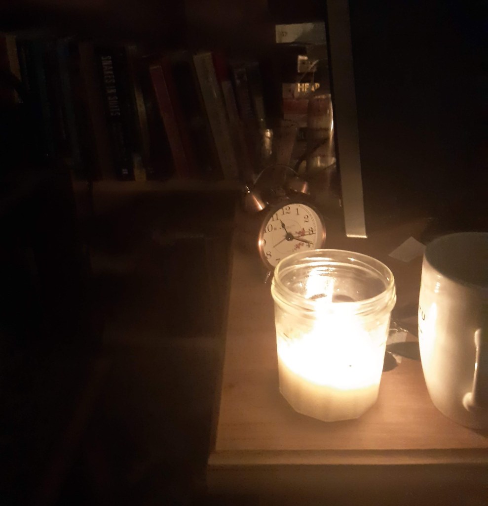 It’s 12:07 – music on, tea made, candle burning. This is it. I have to get this finished today and not into the wee hours of the morning; I have to go into the office tomorrow and that means driving early. Ain’t nobody got time for sleep-deprivation in this scenario.