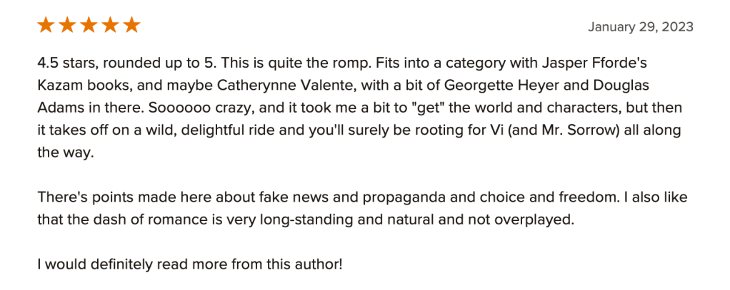 It was, perhaps, written entirely to my own tastes – the romance, the Medusa sub-plot, the trees that are actually alive and also FYI wolves, the sentient rain, the portals, the Suffragist tilt, the longing to do good, the tragedy of failing, the humour, the toxic unicorn manure, and so on and so forth.