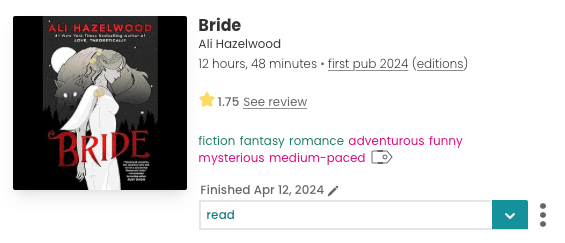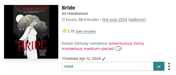 Bride by Ali Hazelwood has the mild ignominy of making me stop what I was doing, horrified by the word that had just popped up into my ears. The boundaries of fandom had been breached.
