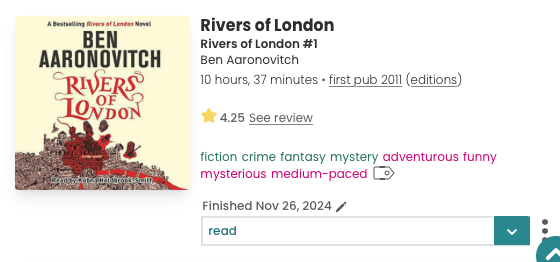 I’m on book five of the Rivers of London series and though perhaps I shouldn’t have binged them quite so quickly – I’ve enjoyed getting to know the characters. Peter Grant is a full-time bobby and part-time magician and though I have questions about the world building and say, for example, the wide-ranging social-economic and historical implications that magic being real and there being river deities DID YOU KNOW HOW MANY RIVERS THERE ARE IN THE WORLD? At least more than ten. AT LEAST … I’m having a good time.