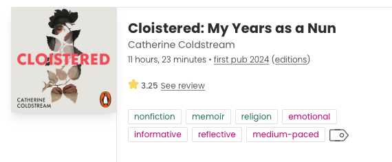 Cloistered: My Years as a Nun was so gripping I listened to it twice – yes, twice! It’s claustrophobic, it’s gripping, it makes you side eye the cloister and wonder if ‘cult’ would be a better word to apply to it.