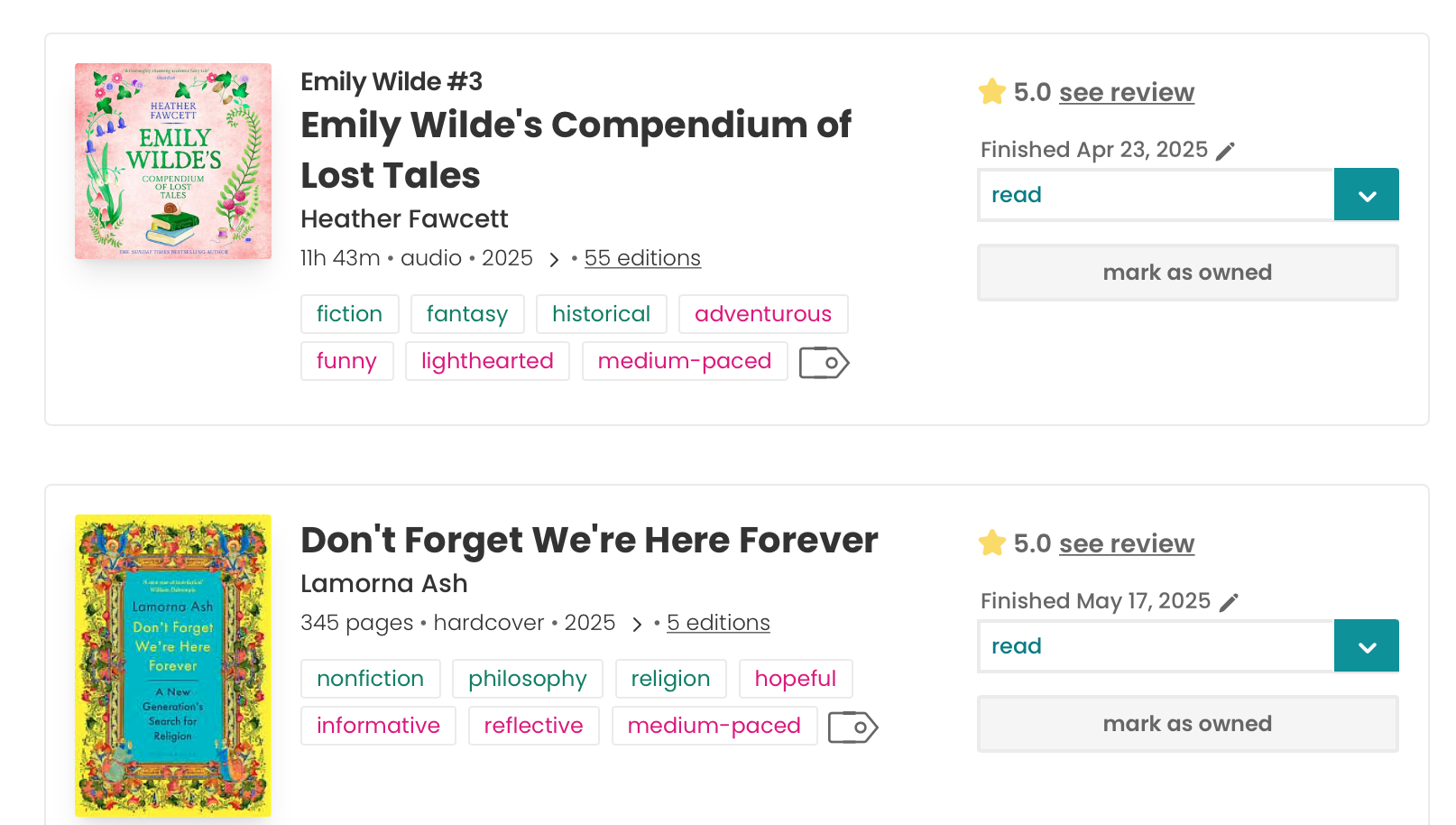 I’m delighted to announce that I’ve beaten my 2025 reading goal of *checks notes* three books. In 2026 I shall lower the bar even further and set it at the dizzying heights of: two. My top five genres were Fantasy, Romance, Historical, Memoir & Classics. I’m not sure what that says about me. (That I’m utterly ordinary probably.) (I accept that too.)